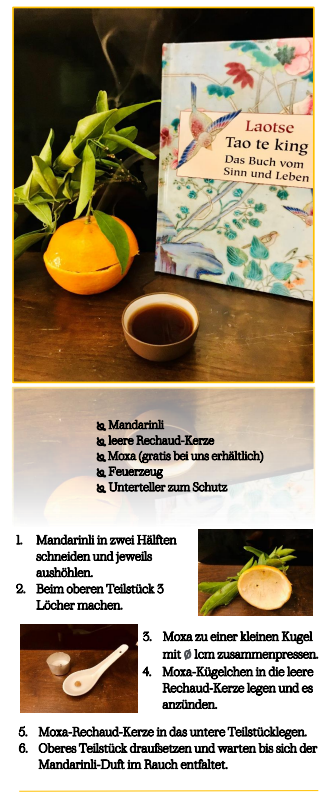 In China ist es normal, dass ein Kind, das sich krank fühlt, einen Tee mit getrockneter Mandarinenschale bekommt, damit es sich schnell besser fühlt. Die Wirkung dieser Schale ist dort längst bekannt: Mandarinenschale hilft bei Krankheitsanfälligkeit, bei Erkältung und bei Abgeschlagenheit. Eine weitere Methode, das Immunsystem zu stärken ist, regelmässig den Duft von glühendem, getrocknetem Beifusskraut einzuatmen. In der Chinesischen Medizin verwendet man diese Pflanze in gepresster Form - sogenanntes Moxa oder Moxibustion. In Kombi mit der Mandarinenschale ist Moxa nicht nur schön in der Nase, sondern auch für den Körper und das Gemüt. Tun Sie sich was Gutes mit einem Moxa-Mandarinli. Anleitung unten.