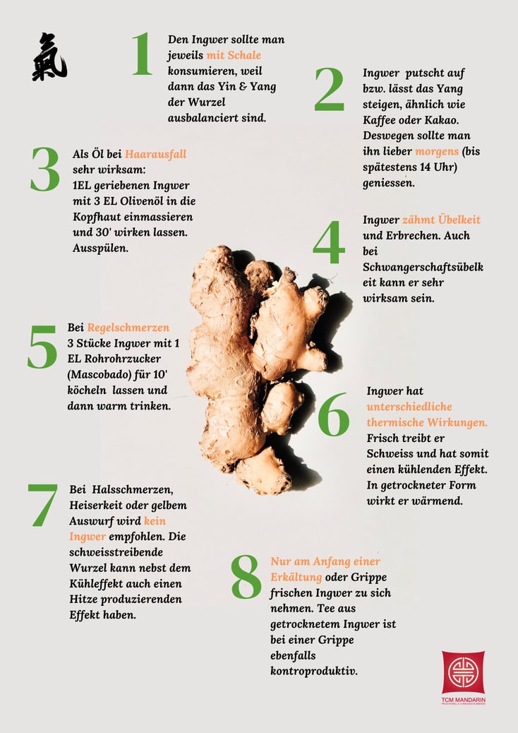 Getrockneter Ingwer ist ein thermisch gesehen warm und deswegen nicht empfehlenswert im Sommer, da dadurch noch mehr Hitze in den Körper gelangt. Frischer Ingwer hingegen, bewirkt genau das Gegenteil: er leitet die Hitze aus dem Körper raus. Wichtig ist, dass die Schale noch dran ist.